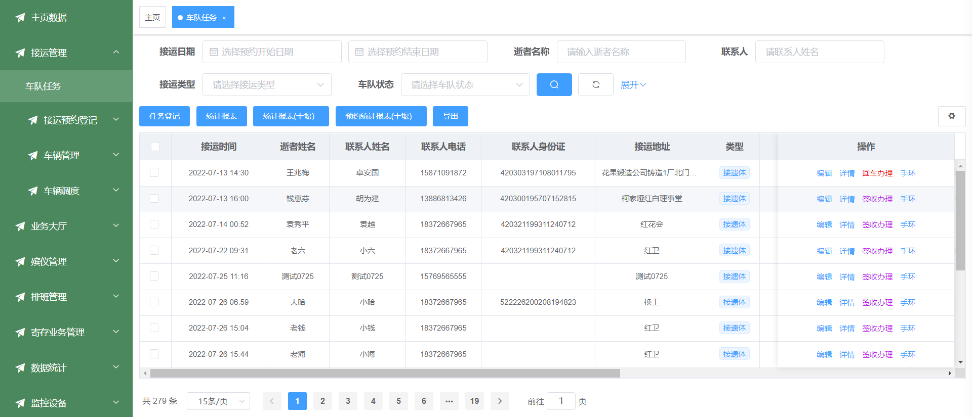 2、丧属通过电话或者在线预约殡仪馆接运业务,预约时在系统中登记预约信息,后台审核预约信息,再按照接运遗体的馆内运力和丧属安排具体的接运时间。车辆调度中心根据登记的接运任务和当前车辆使用情况,安排车辆和司机出车接运,接到调度任务,登记出车信息,打印派车单,打印二维码,接运返回后,登记返回接运信息,更新车辆使用状态。